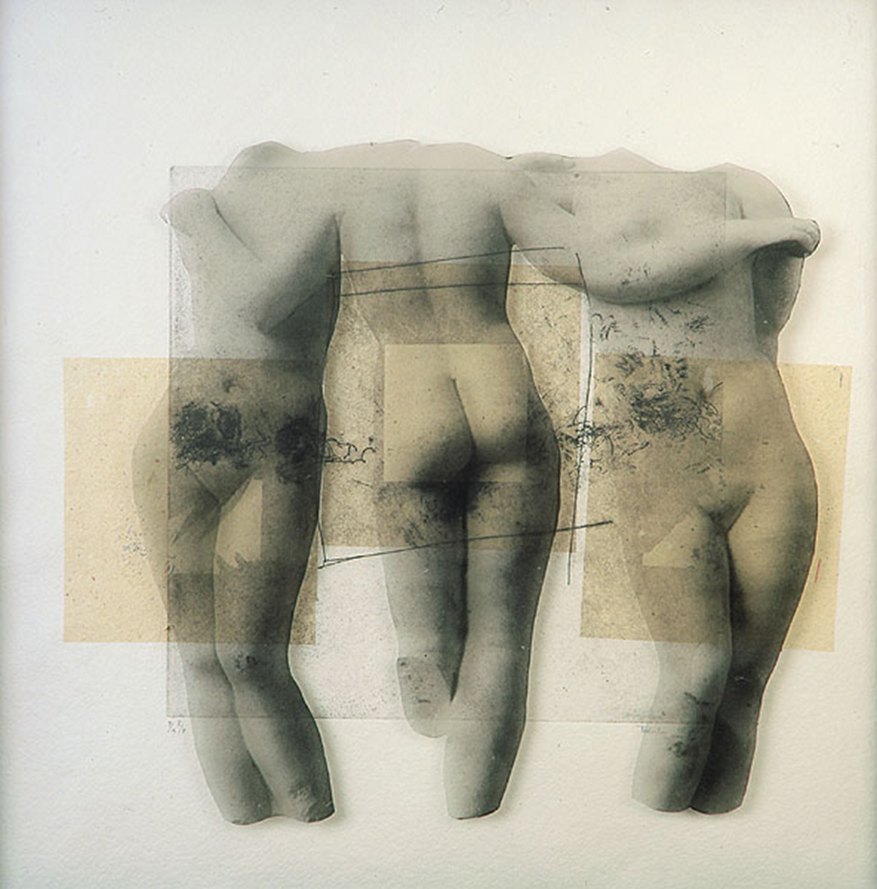 Litografía, punta seca y collage sobre papel artesanal de Aquari y positivado sobre película lith, montados en una caja de / Lithography, drypoint and collage on handmade Aquari paper and lith film printing, mounted on a frame box